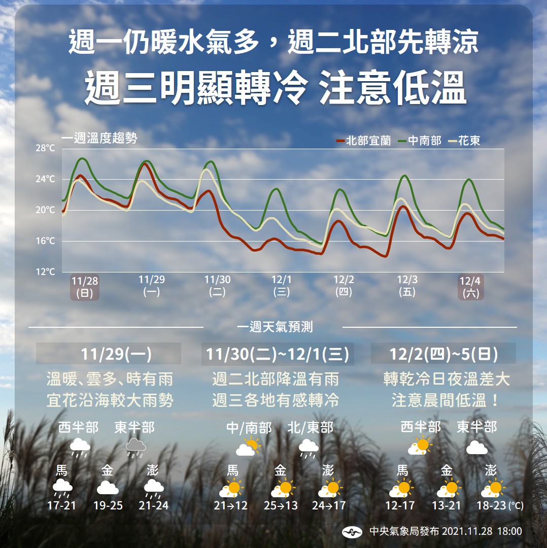 2021年11月29日台灣29日東北季風稍減弱,各地氣溫稍回升;南方雲系北移,台灣半部有短暫雨,並有局部大雨發生的機率,南部地區及澎湖、馬祖有局部短暫雨,中部地區及北部山區有零星短暫雨,其他地區及金門為多雲。30日鋒面通過,東北季風增強或大陸冷氣團南下,北部及東北部天氣要轉冷了。