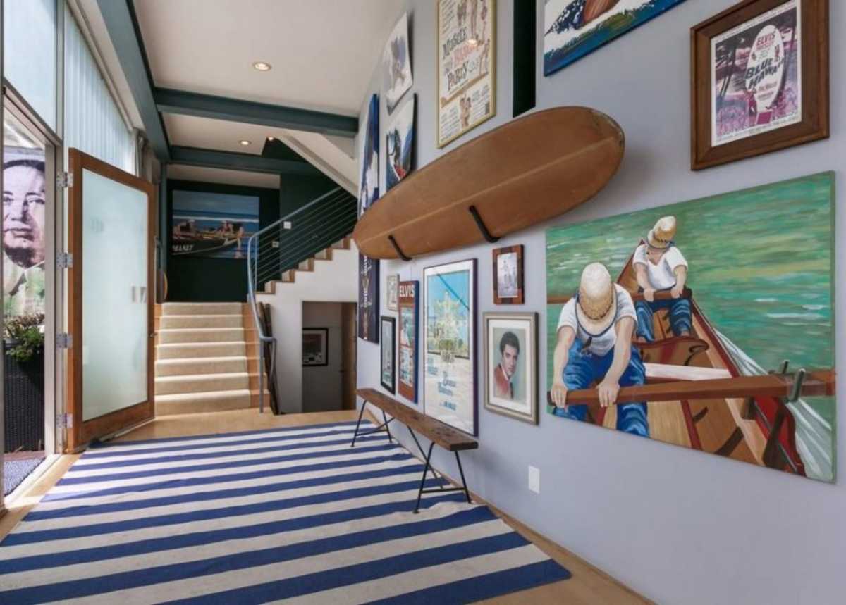 ▼門廳的海浪地毯和牆壁上的滑板裝飾,讓人感覺舒適又放鬆。