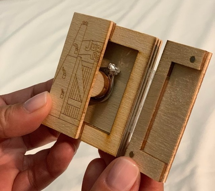 ▼「這是我們的訂婚戒指盒。我們第一次約會就看了《侏羅紀公園》,於是我決定做一個侏羅紀公園造型的戒指盒。」