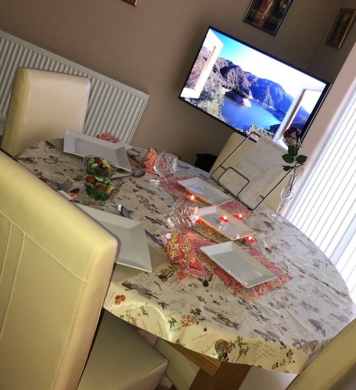▼「我們在一起18個月的紀念日,男友精心佈置家裡成餐廳,親自下廚和準備了義大利音樂,甚至連電視機也在播放著美景~這一切都太有感覺了。」