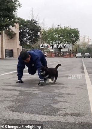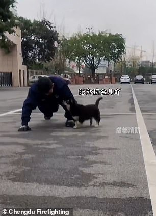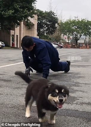 ▼這位消防員平時應該經常照顧小狗,小狗跟他很親近,看到他在做伏地挺身,就跑過去找他一起玩。消防員忙著訓練,不能陪伴小狗,小狗也不在乎,繼續在他身邊跑跑跳跳、狂搖尾巴。