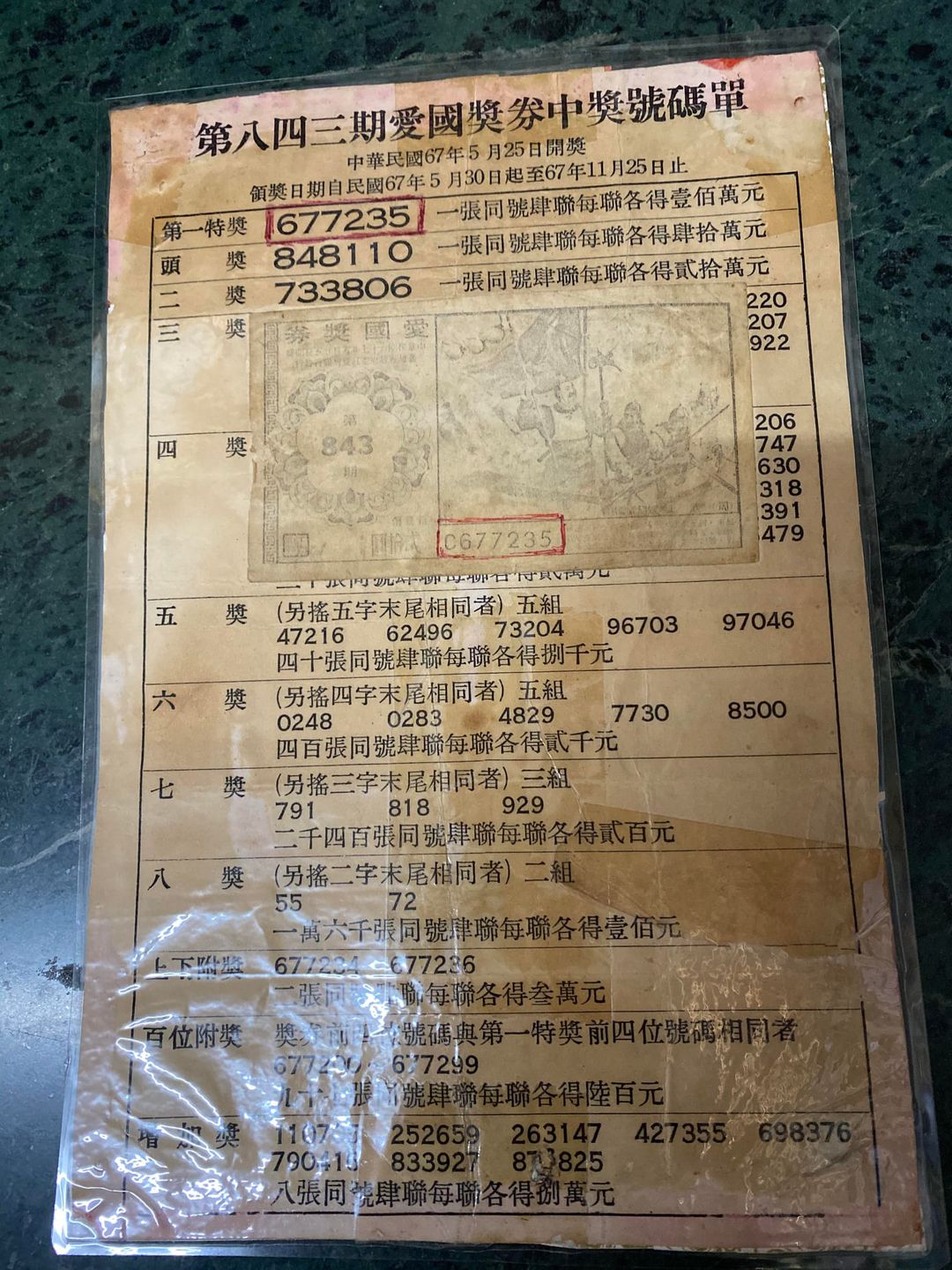 ▼原po貼出那張愛國彩券的照片。愛國獎券是從1950年4月1日正式發售的,第一期的最高獎金為新台幣20萬元,中間歷經多次修改,後來變成了「一張獎券一個號碼」的模式。1985年時,民間開始興盛大家樂,而大家樂的號碼是利用愛國獎券最後兩碼來對獎的,所以政府決定從1988年起停止發行愛國獎券。1987年12月27日所發行的第1171期愛國獎券就是最後一期了。