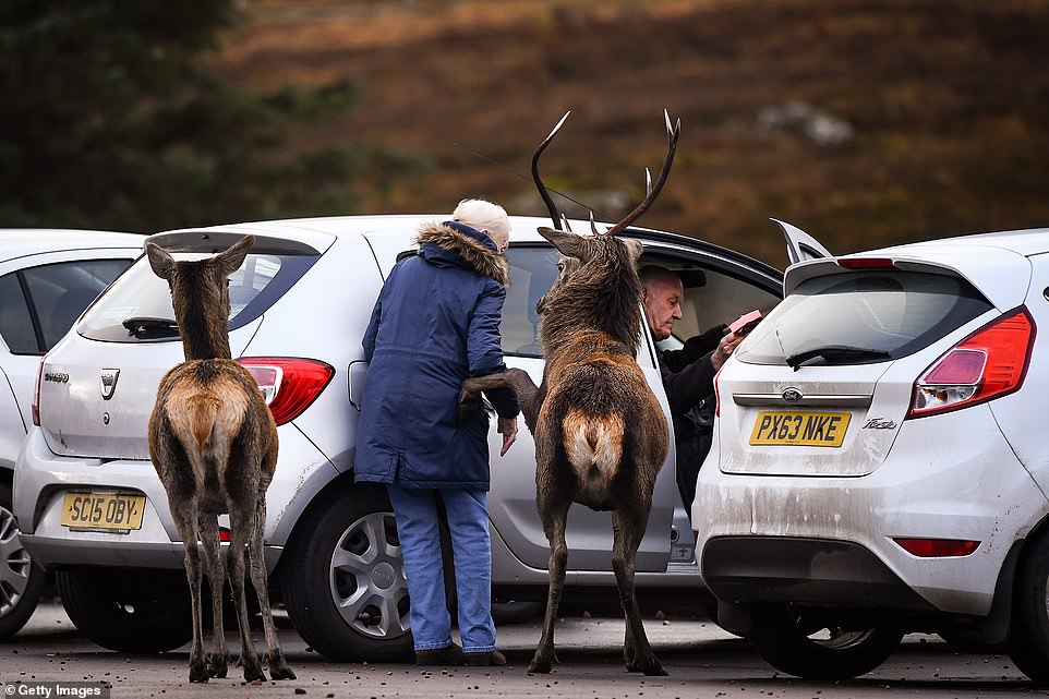 ▼當時這對夫妻開車途徑格倫科,可能準備去賞附近的瀑布或山間小道散步。兩隻歐洲馬鹿圍住他們的車,但他們並不驚慌,老婦人還下車來到後車門的位置。雄鹿站在老婦人右側,主動抬起蹄子放到她的手邊,她的表情非常平靜。坐在駕駛座上的丈夫則淡定查看手中的東西,也沒有將身旁的野生動物放在心上。