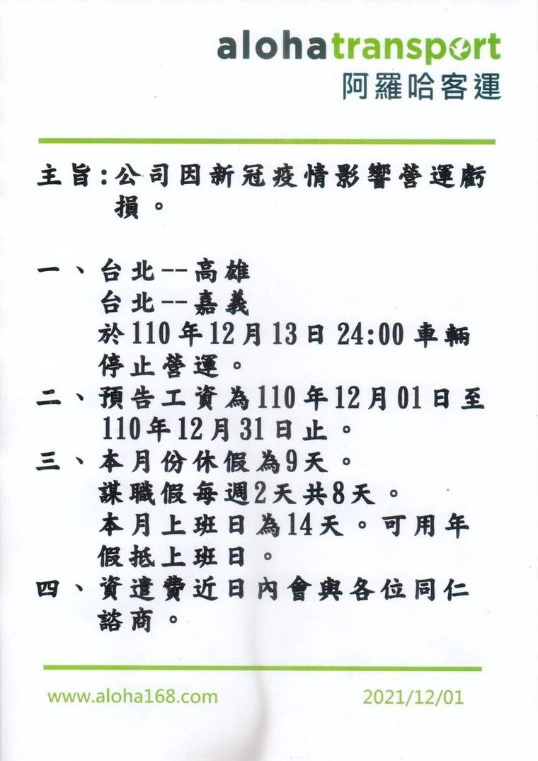 2021年12月03日11月份曾傳出財務不佳的阿羅哈客運真的撐不住了。阿羅哈客運內部對員工發出公告,指因為疫情影響,營運虧損,台北-高雄、台北-嘉義等兩條路線將於12月13日午夜起停止營運。而結束這2條路線後,也等於宣告阿羅哈客運全面停駛。