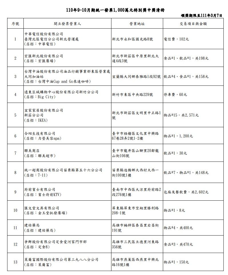 2021年12月03日財政部於2日下午公布110年9、10月期統一發票完整中獎清冊。這次共開出13張特別獎(新台幣1000萬元)及16張特獎(200萬元)。本期最令人羨慕的是一位屏東民眾,他僅花8元在文具店購買文具,就爽中1000萬元的特別獎。