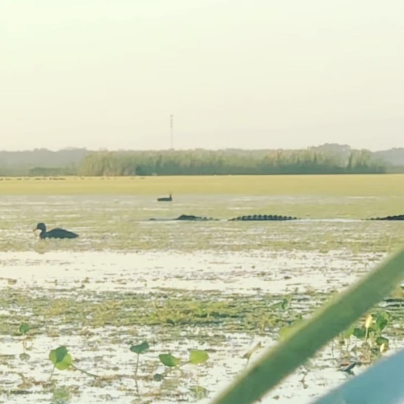 ▼當時Kevin Stipe和Cass Couey到佛羅里達州利斯堡(Leesburg)的一處沼澤準備獵鴨,中途卻看到一隻巨鱷悄悄浮出水面,一口將毫無防備的鴨子吞下肚。牠的嘴巴一張一合,似乎是在咀嚼。Kevin和Cass嚇了一跳,也很懊惱,因為他們的獵物被搶走了。他們無奈說:「好了,你現在吃夠了,趕快離開這裡吧!」