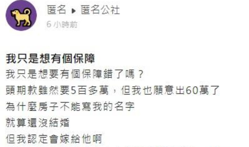 原po表示,她和男友已經到了談婚論嫁的階段,兩人看上一間房子,頭期款要500多萬,她出60萬元,希望房子能登記她的名字,但男友不同意。這讓她非常氣憤:「我只是想要有個保障錯了嗎?頭期款雖要500多萬,但我也願出60萬了,為何房子不能寫我的名字?」