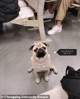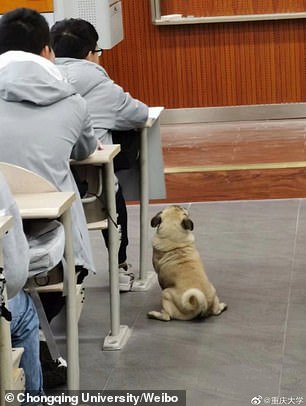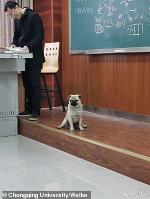 ▼這隻狗狗平時就生活在校園裡,經常有學生給牠餵食,所以牠並不怕人。那天牠誤闖課堂,不僅蹲在第一排認真聽講,還跑到講台上圍著老師的腳繞來繞去。同學們的目光都被狗狗吸引,老師也覺得很好笑,後排的學生更拿出零食給牠吃。