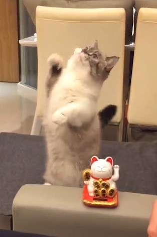 ▼一開始牠一臉疑惑的看著招財貓,可是當牠發現主人一直望著招財貓時,Pooky仿佛吃醋似的竟然開始學起了招財貓來,用後腿站立而前爪則不斷在空中揮舞!