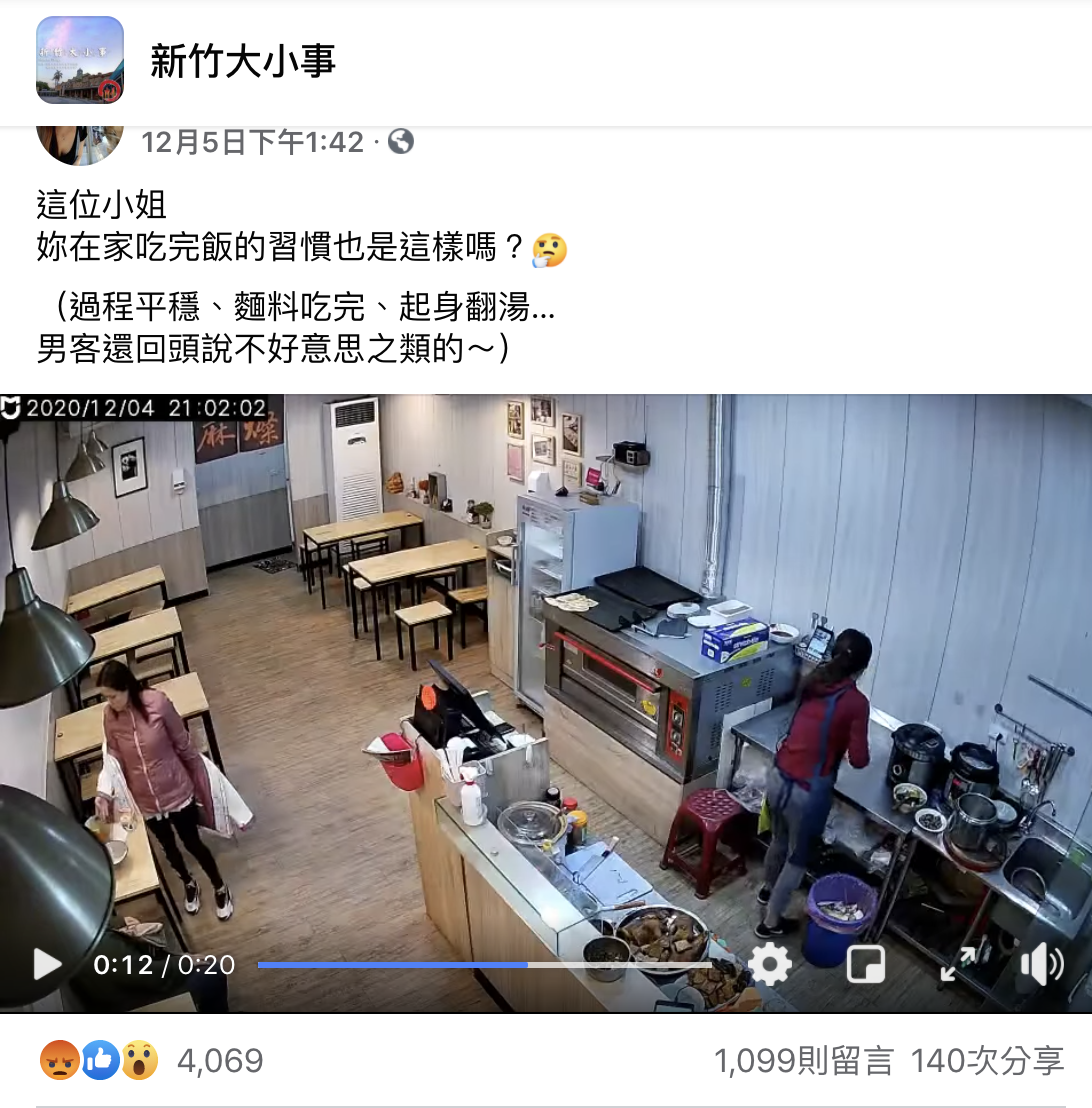 2021年12月10日在外用餐如果遇到跟餐點有關的問題,可以向店家反應,或到Google評論留言。最近新竹一間小吃店中發生一個小插曲。一名女客人吃完飯準備離開時,竟故意將桌子上的湯碗弄翻。網友們看到監視器畫面都覺得很不可思議。