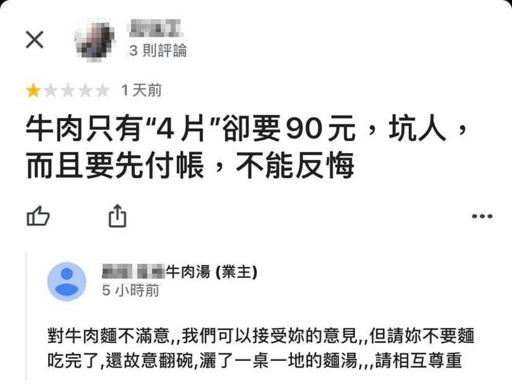 ▼也有網友好奇,那名女客人為什麼要做這樣的事,是不是跟店家發生爭執?後來店家po出女客人在Google上的評論,只見她寫道:「牛肉只有4片卻要90元,坑人,而且要先付帳,不能反悔。」店家冷靜回應:「對牛肉麵不滿意我們可以接受妳的意見,但請妳不要麵吃完了還故意翻碗,灑了一桌一地的麵湯,請互相尊重。」
