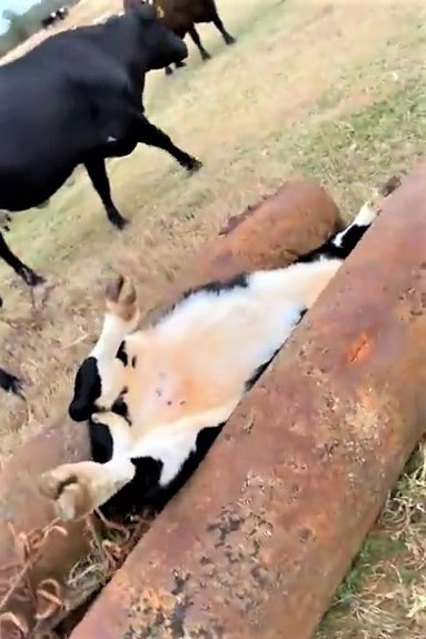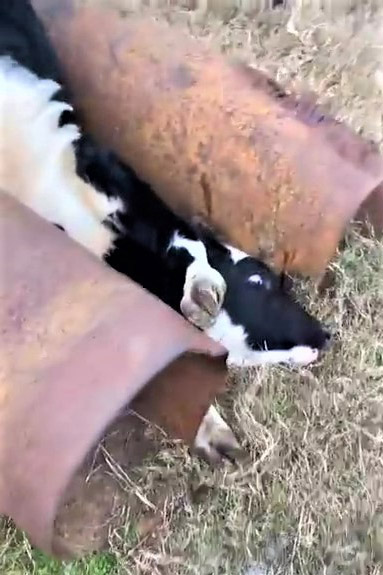 2021年12月10日這是牛牛最尷尬的時刻!日前美國德州納科多奇斯(Nacogdoches)女網友Lisa Anthony回家時,發現自家牧場裡的氣氛怪怪的。一群牛不像平時一樣悠閒吃草,而是聚集在2根舊鐵管附近,牠們到底在做什麼?Lisa仔細看了一下,原來有一隻小母牛被卡在了鐵管之間~