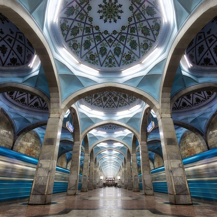 ▼烏茲別克塔什干的Alisher Navoi站:烏茲別克首都塔什干的地鐵系統並不出名,但這是世界上最具藝術氣息的地鐵系統之一,多數車站都裝飾得非常華麗。1994年啟用的Alisher Navoi地鐵站就是清真寺式建築,被認為是塔什干最美的地鐵站之一。
