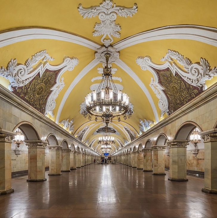 ▼俄羅斯莫斯科共青團站:這座地鐵站是非常重要的交通樞紐,裝飾也非常豪華。站台里有青銅枝形吊燈、大理石拱廊和巨大的彩石馬賽克。用傳統技藝製成的馬賽克壁畫上,描繪的是列寧在紅場發表演講的圖案。