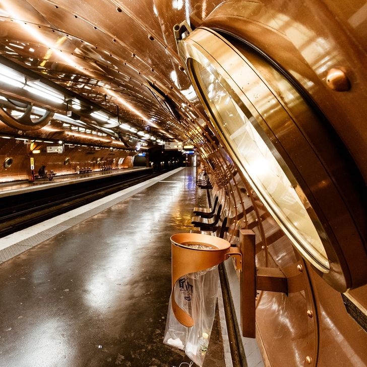 ▼法國巴黎Arts et Métiers站:為紀念工藝美術館建館200周年,比利時畫家François Schuiten將這座地鐵站設計成了潛艇的模樣。地鐵站內采用了大量鉚釘裝飾和暖色金屬,風格獨特。
