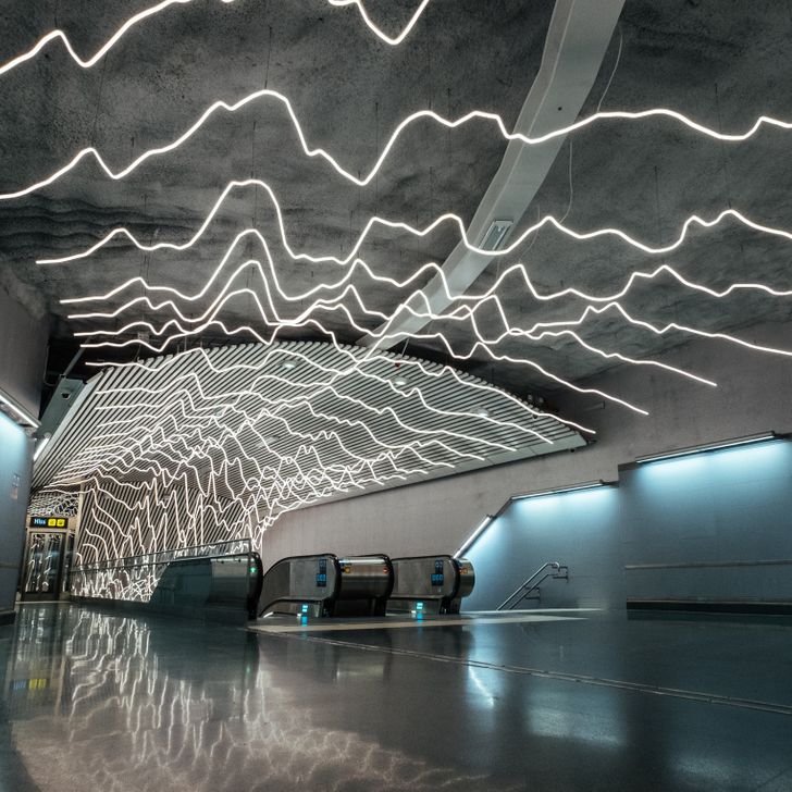 ▼瑞典斯德哥爾摩Odenplan站:車站天花板上的「LED白線」共有400公尺長,營造出迷人的氛圍。