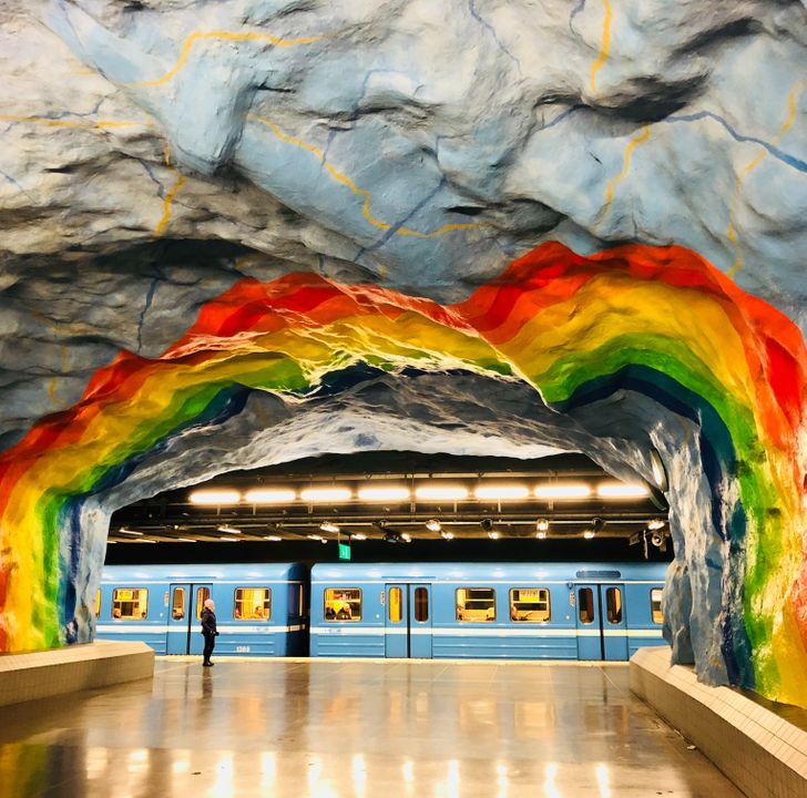 ▼瑞典斯德哥爾摩Stadion站:這一站由藝術家Enno Hallek和Ake Pallarp聯手打造,以充滿活力的彩虹圖畫裝飾出藝術大拱門,充滿節日的歡樂色彩。