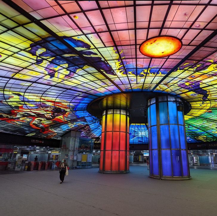 ▼台灣高雄的福爾摩沙大道地鐵站:這座地鐵站裝置4,500片鑲嵌玻璃藝術,呈現出如同萬花筒般的視覺效果,據說這是世界上最大的玻璃藝術裝置。