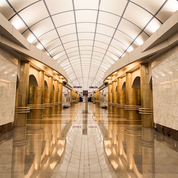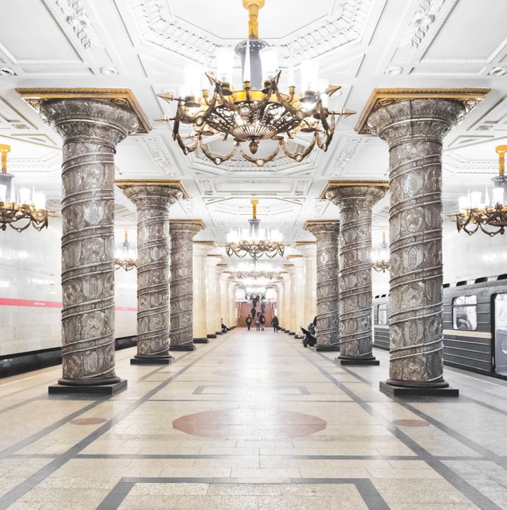 ▼俄羅斯聖彼得堡Avtovo地鐵站:這座地鐵站的地下大廳有46根柱子,其中30根柱子是大理石的,另外16根則裝飾著帶有浮雕的特別玻璃板。這些玻璃板是由光學玻璃專家設計的,能讓人產生視覺錯覺。