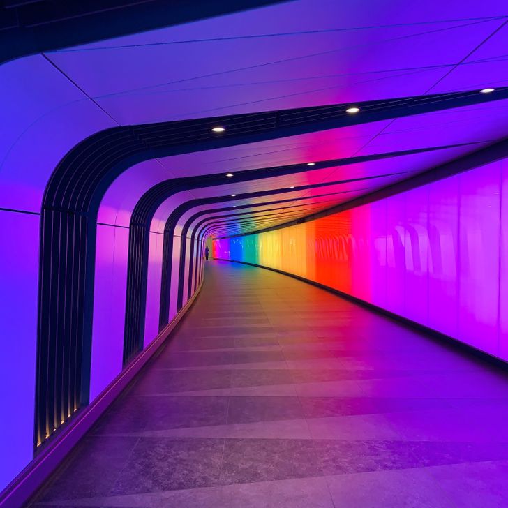 ▼英國倫敦國王十字車站:這是世界上最古老的地鐵站之一,車站出口的這條90公尺長隧道,牆壁上有LED燈裝置,會不斷變換顏色。