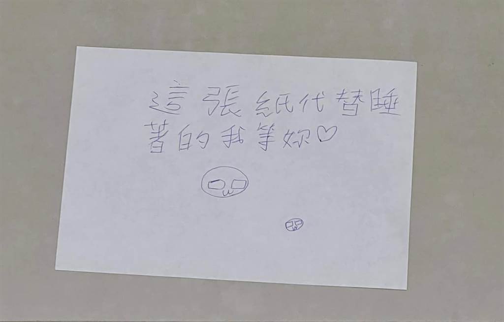 這位單親媽媽在臉書社團「爆廢公社」發文表示:「誰說兒子不貼心!」她分享說,最近因為工作常常得晚歸,每天晚上10點打烊後還要清潔打掃,最快11點才能回到家。有一天她因為洗油鍋,拖到快凌晨1點才到家,沒想到一進門就看到地上有一張小紙條,上面寫著「這張紙代替睡著的我等妳」,還附有一顆愛心和兩個可愛的表情符號。