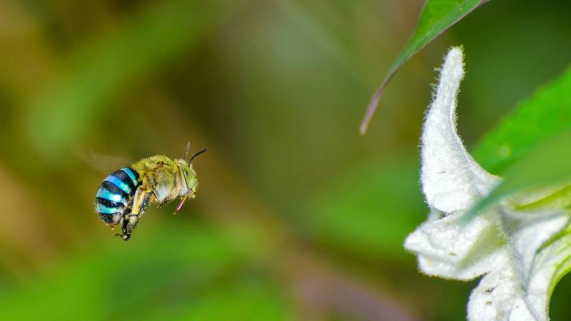 ▼藍帶蜂體長約11毫米,壽命比較短,只有40天左右。牠們授粉的方式很特別,會抓住花朵搖晃身體,或者直接用頭去撞花朵,讓花粉掉落然後採集。番茄、藍莓、奇異果、茄子等等都能用這樣的方式授粉。
