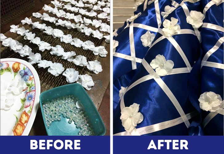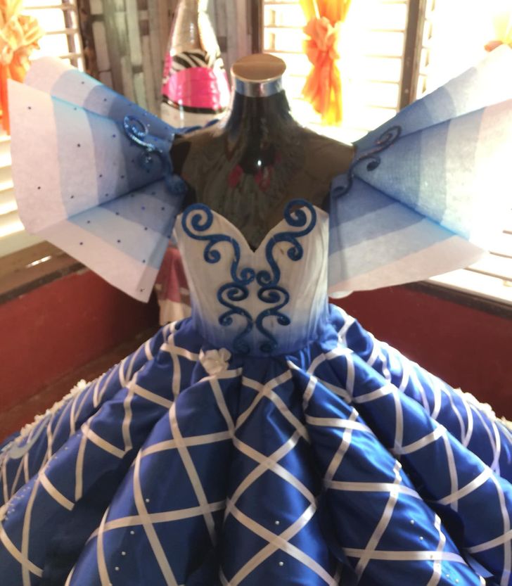 ▼Maverick將布料剪成蓬蓬裙擺的形狀,貼上交叉的緞帶,再把手作的白色花朵一朵朵貼到禮服上。本來單調的藍色布料經過裝飾,變得華麗又夢幻。