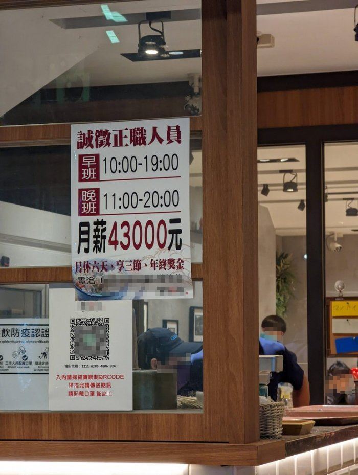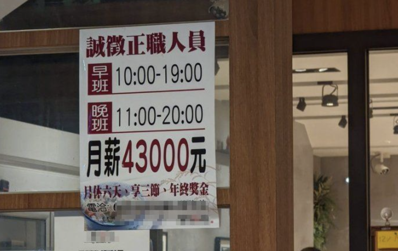 原po在Dcard上發文說,自己經過竹科的一間平價麵食館,看到玻璃上貼著徵人啟示,要找早、晚班正職員工,月薪43K,月休6天,享有三節以及年終獎金。他忍不住驚呼:「正職的月薪,竟然快要比我在竹科當工程師的月薪高了!」