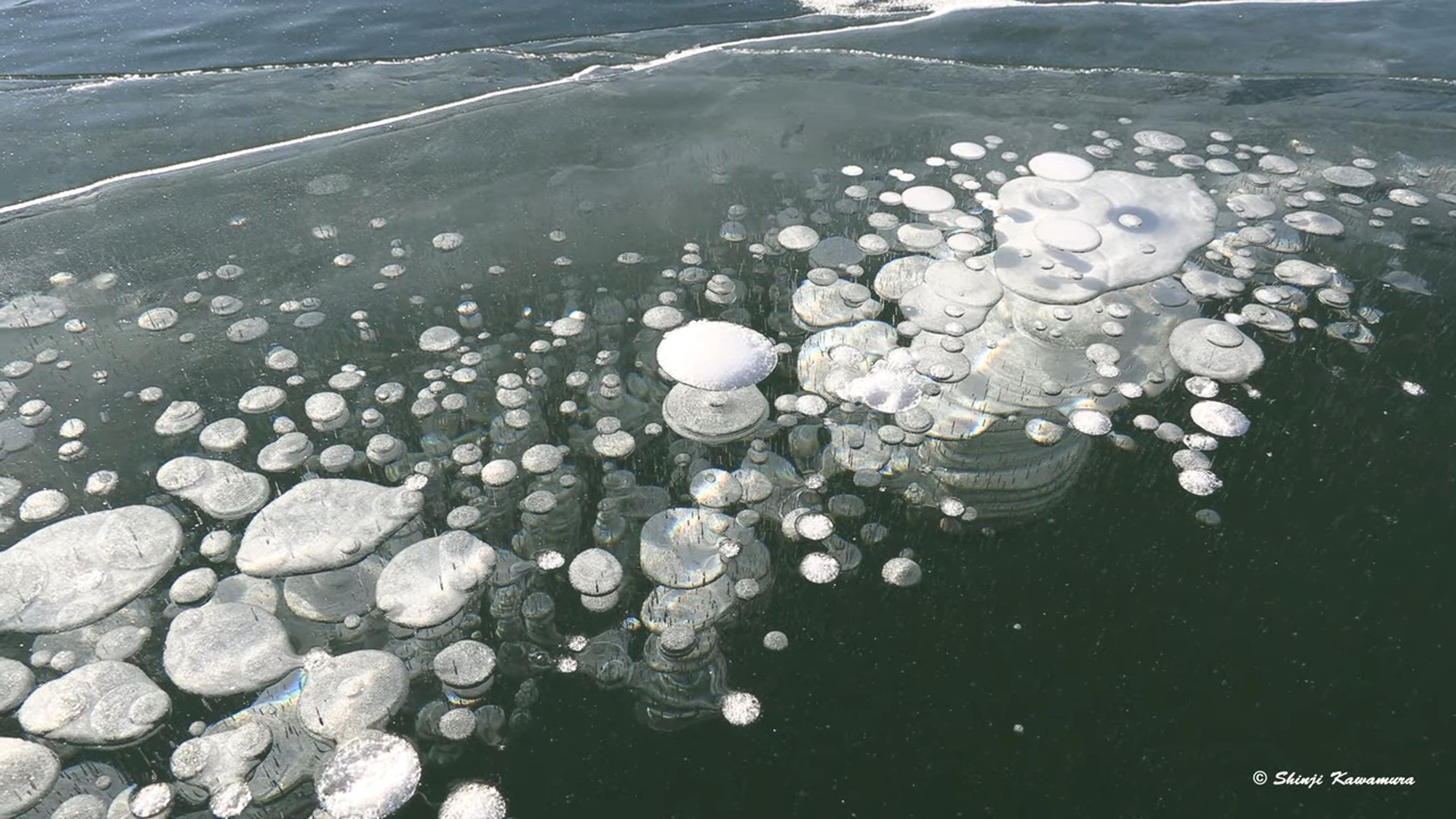 2021年12月14日自然界真奇妙!北海道的冬天有美麗的雪景,除此之外,結冰湖面的「冷凍泡泡」也是當地的一項特色。北海道的冬天非常寒冷,很多湖水都會整塊結冰。在這些大冰塊之下,能看到很多凍起來的「結冰泡泡」,這是北海道冬天的奇景之一。