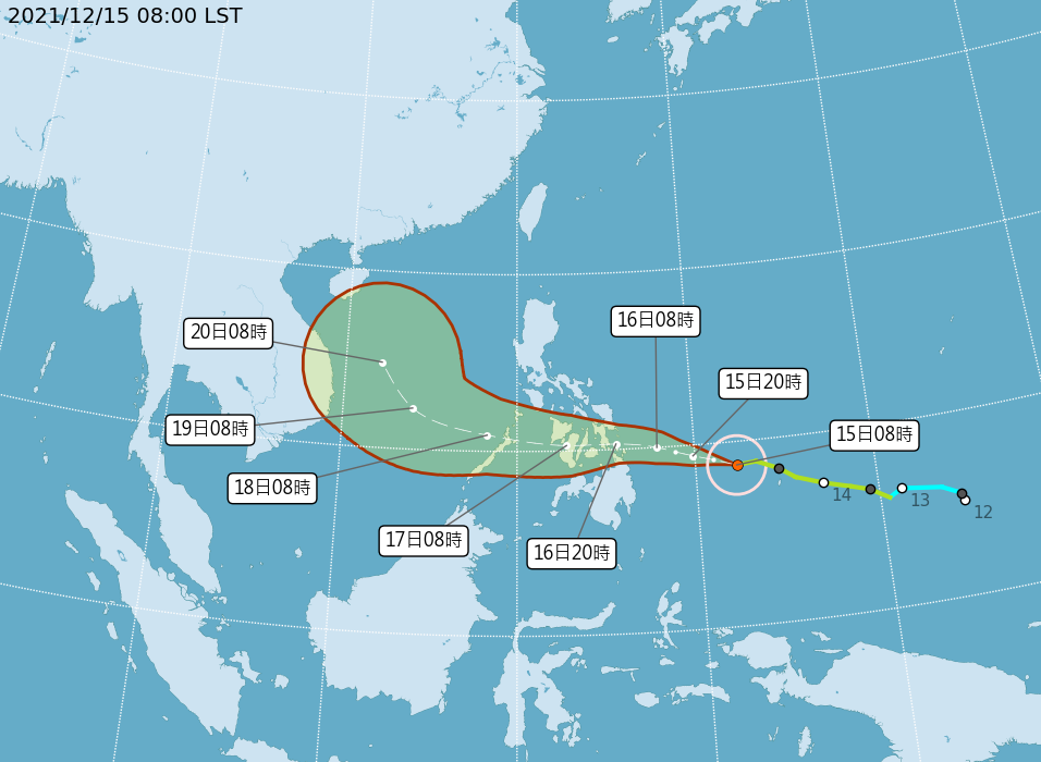 2021年12月15日第22號颱風「雷伊」已於今天(15日)上午增強為中度颱風。中央氣象局表示,預估颱風將在週末進入南海後北轉,有可能接近台灣。受其外圍水氣影響,下週一、週二(20、21日)北部及東半部將有持續性降雨,中南部也要注意零星降雨。