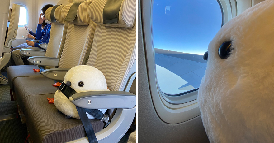 ▼推主說:「抱著銀喉長尾山雀玩偶搭飛機,結果空服員說起飛的時候抱著很危險,於是幫我這麽安排了。」