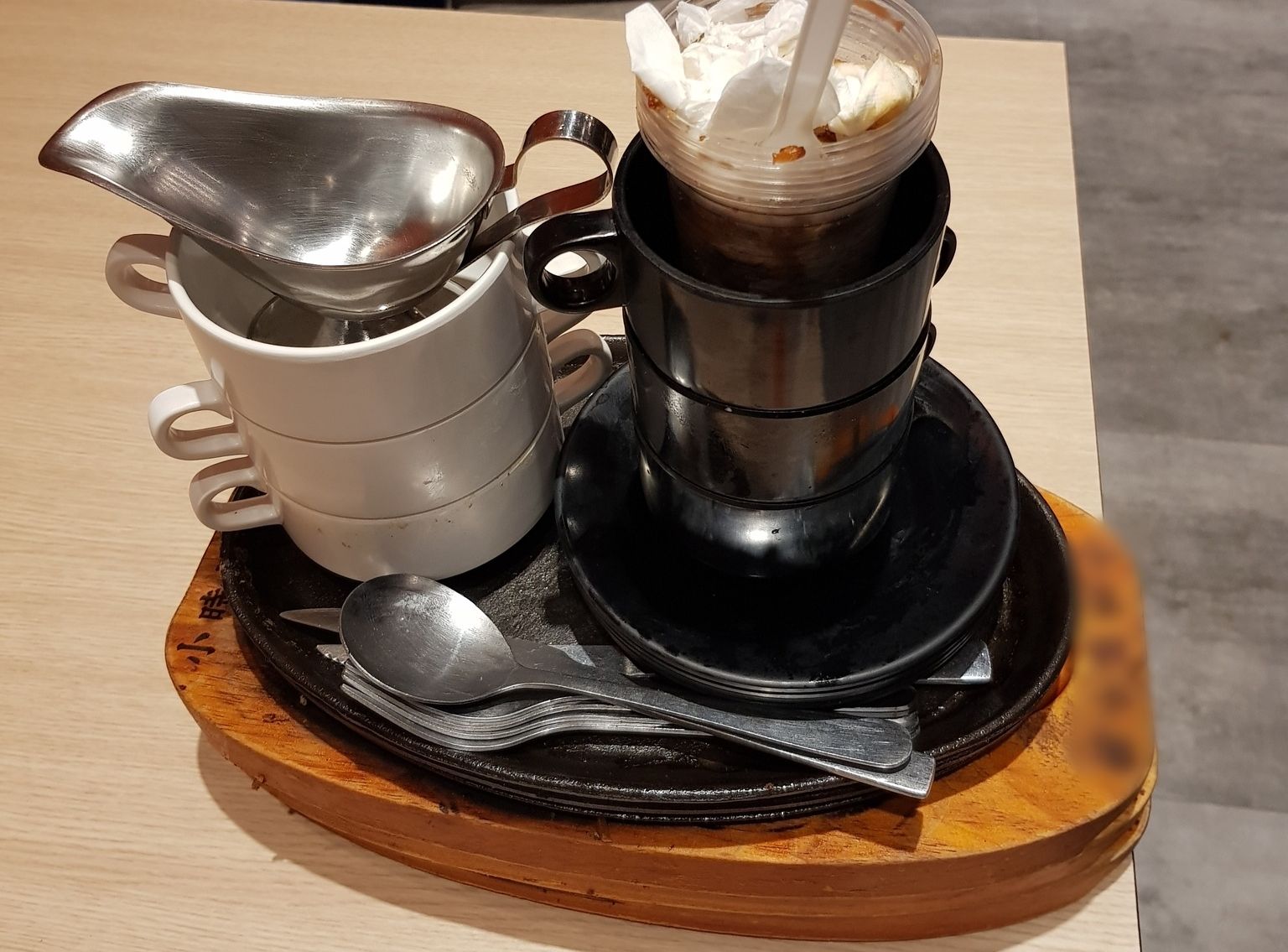 ▼從照片中可以看到,桌面非常乾淨,餐具被層層高疊,最底下放著牛排鐵盤和木盤,黑色瓷盤、醬料容器、馬克杯、湯匙堆疊著,最上面是塑膠杯,裡面塞著用過的衛生紙。這一桌客人將餐盤擦得非常乾淨,一點也不像剛用餐完的樣子。