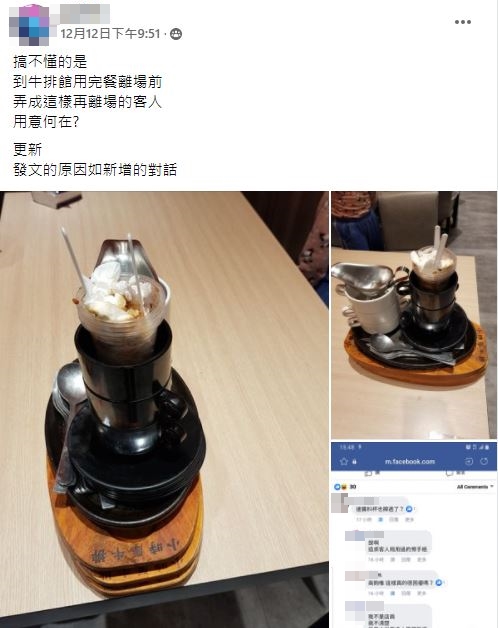 ▼原po指出,他在牛排館用完餐離場前,發現隔壁桌的客人將桌面收拾得非常乾淨,還拿用過的擦手紙將醬料杯都擦過了。原po之前看過有人說這種行為很雞婆,所以發文詢問:「弄成這樣再離場的客人用意何在?」
