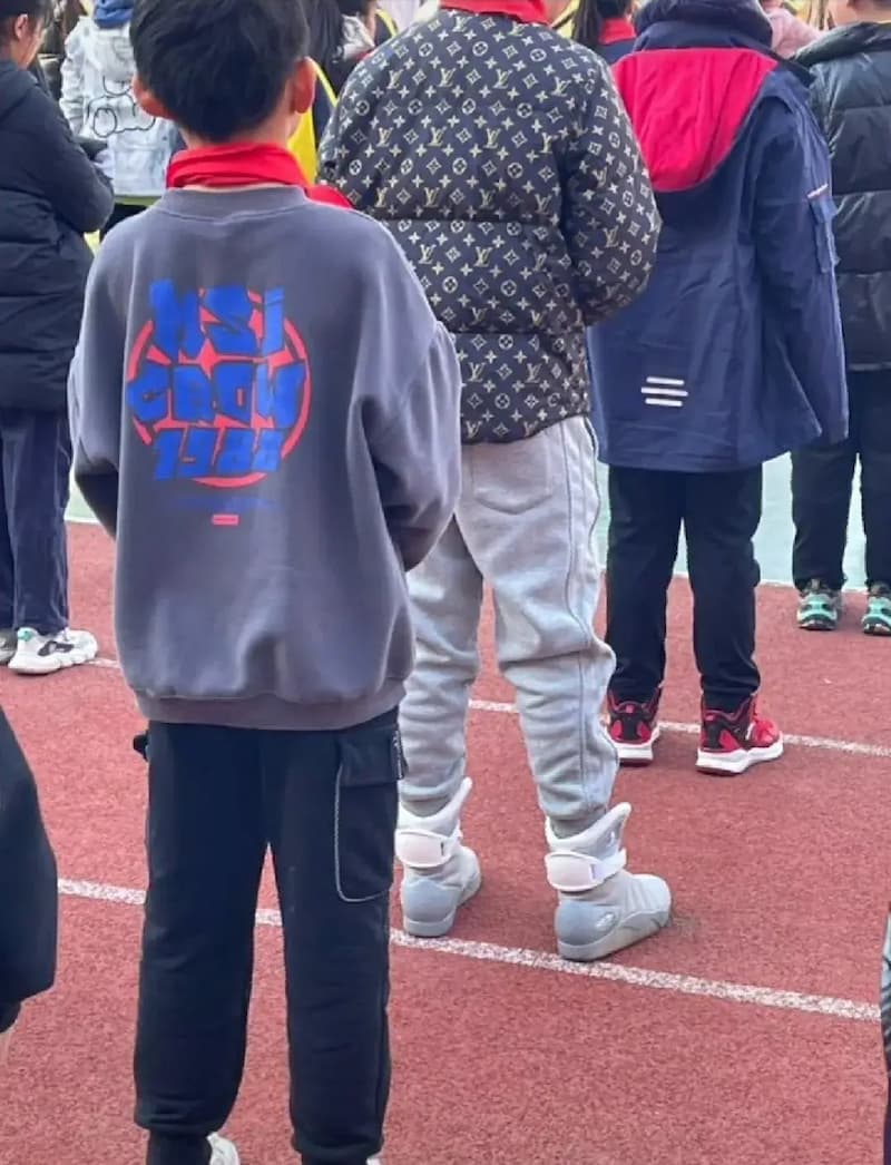 從照片中可以看到,這名小學生穿著大牌精品「LV」的羽絨外套,一件要價近38萬人民幣(約台幣166萬元);運動長褲看似普通,也要3千700元(約台幣1萬6千元);腳上的鞋子是全球限量款,價格更是驚人,要價81萬人民幣(約台幣354萬元)。