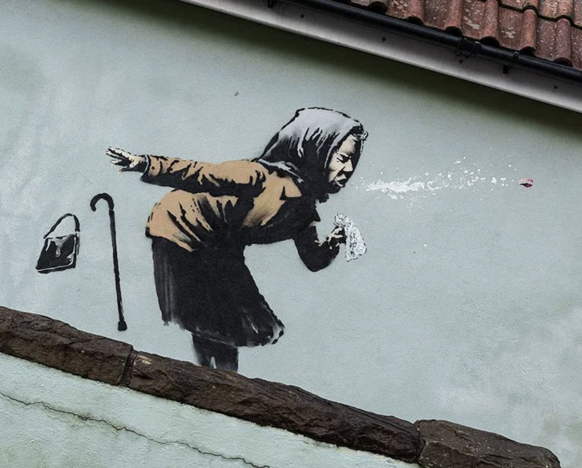 ▼Banksy在IG上承認這幅名為「Aachoo!!」的塗鴉畫是他創作的。畫中的老婦人因為打噴嚏口沫橫飛,連假牙都飛出來了。