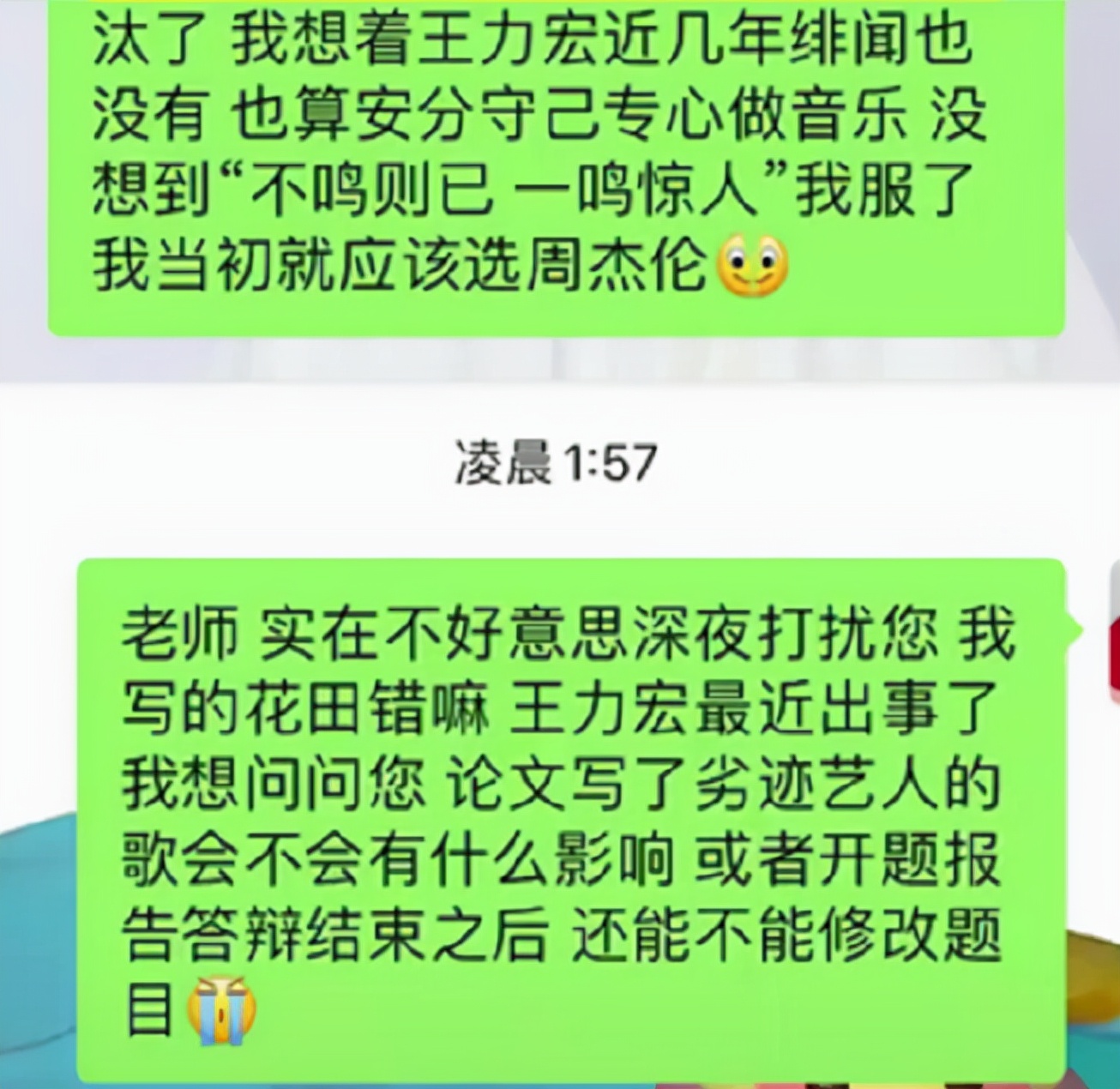 ▼但另一張聊天記錄卻顯示,這名歌迷凌晨2點傳訊給指導老師,詢問:「老師實在不好意思深夜打擾您…王力宏最近出事了,我想問問您,論文寫了劣跡藝人的歌會不會有什麼影響,或者開題報告答辯結束之後,還能不能修改題目?」她還在最後附上一個「大哭」的表情符號,可見內心有多崩潰。