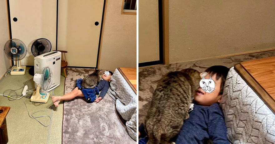 ▼推主已經在浴室準備好洗浴用品,催促兒子趕快來洗澡。沒想到兒子待在客廳沒有過來,還說:「我現在真的不行。」他疑惑地走出浴室查看情況,竟看到自家的愛貓正默默地趴在兒子的肚肚上。兒子面帶笑容,躺在地上一動也不動,好像在說:「我現在真的不能動啊。」