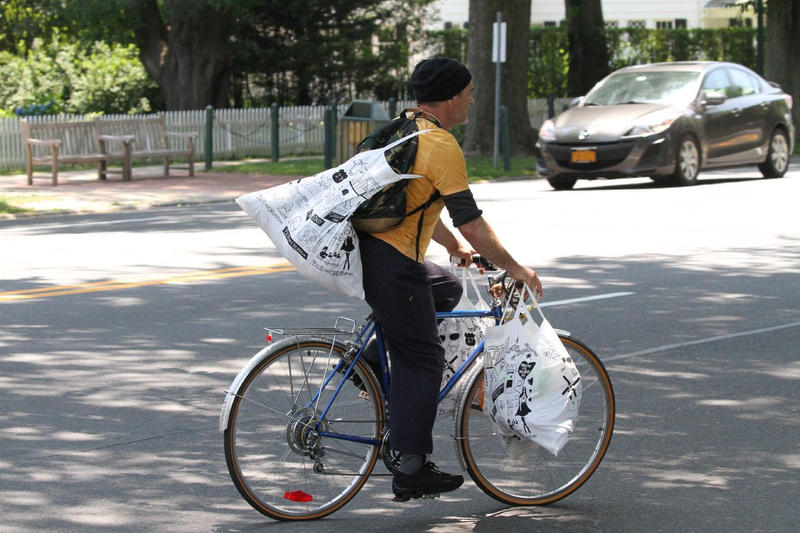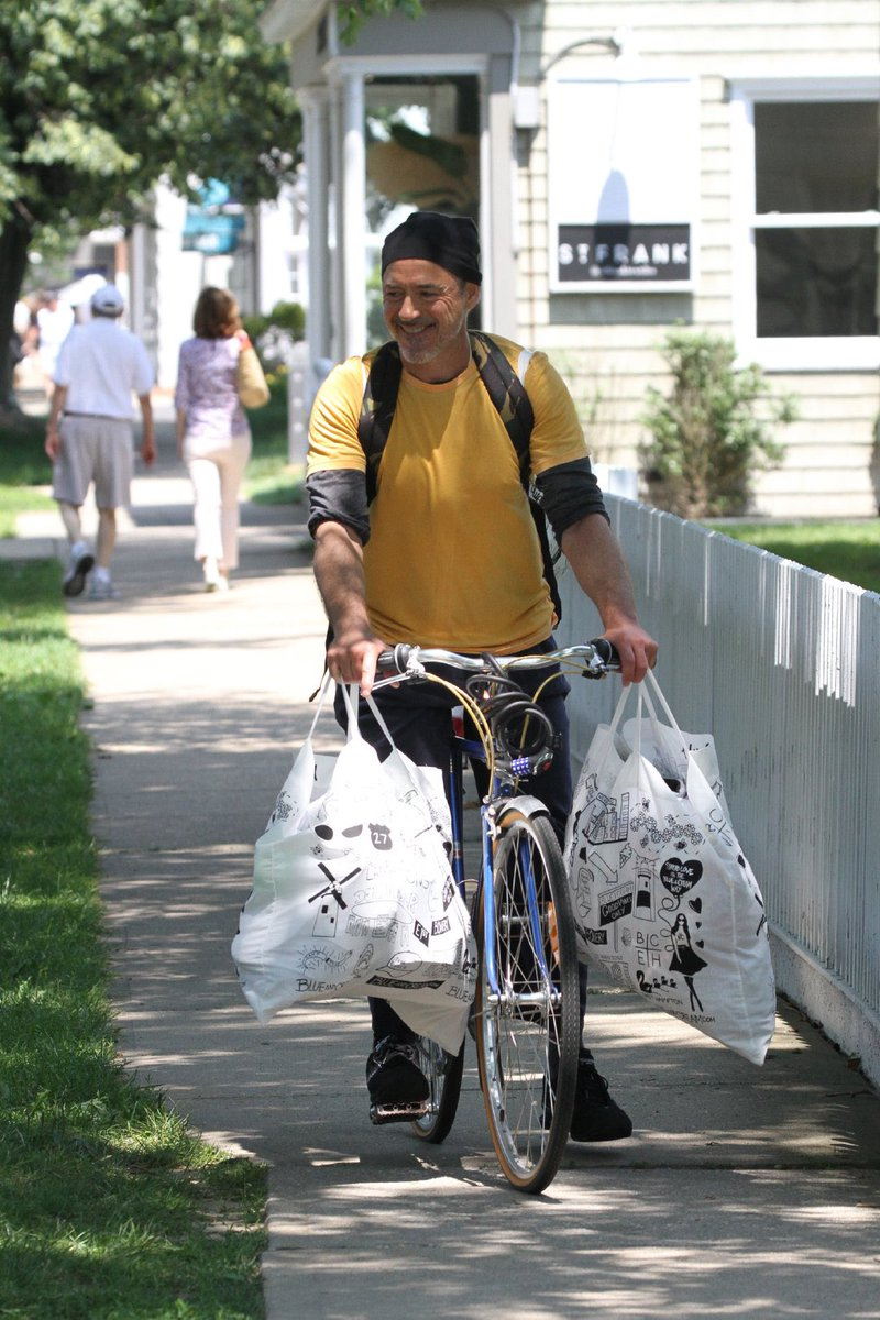 ▼小勞勃道尼發現自己被拍後,臉上露出可愛的笑容。他雙手各提著一個超大的購物袋,背上還背著一大袋,那提著大包小包騎腳踏車的樣子,跟電影中那個總是開著超跑、作風高調的鋼鐵人差別非常大。