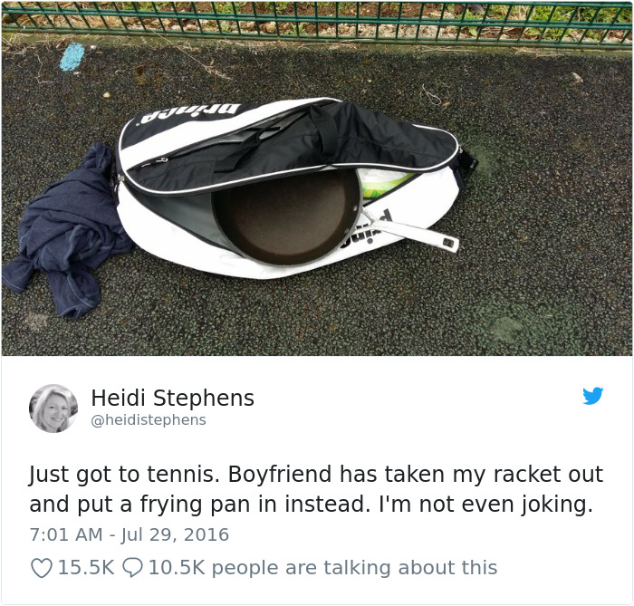 ▼男友將她放在袋子中的網球拍換成了平底鍋。