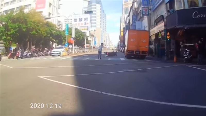 ▼這起事故發生在台中科技大學前。當時交通號志已經由紅燈變成綠燈,於是騎士往前騎,準備通過路口。沒想到一名女子突然從右邊的路口沖出來,騎士想從女子的後方閃過,但女子也跟著往後退。騎士只能急剎車,結果連人帶車滑倒。