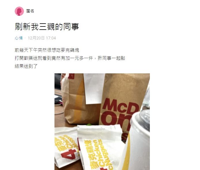 2021年12月23日連鎖速食店麥當勞經常推出新品與優惠,不少外食族會揪團訂餐去嚐鮮。日前一名女網友在Dcard發文抱怨,她與同事揪團合購麥當勞「雞塊加1元多1件」,對方竟說「我只出1元」。這讓原po大傻眼,不禁驚呼:「刷新三觀。」