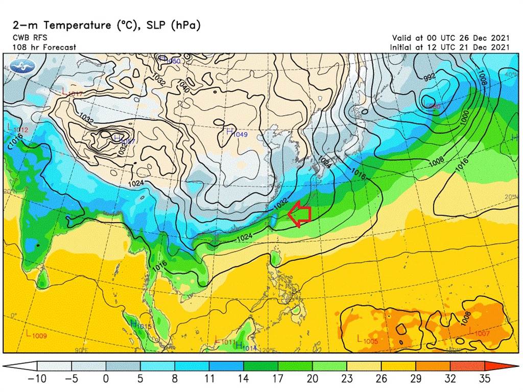 2021年12月23日中央氣象局表示,今、明(23、24日)兩天水氣偏多,台灣北部、東半部地區及馬祖有局部短暫雨,中部地區及南部山區亦有零星短暫雨,其他地區及澎湖、金門為多雲的天氣。入冬以來最強冷空氣將在週六(25日)南下台灣,一路冷到下週二(28日),全台連凍4天,可能創下入冬新低溫。