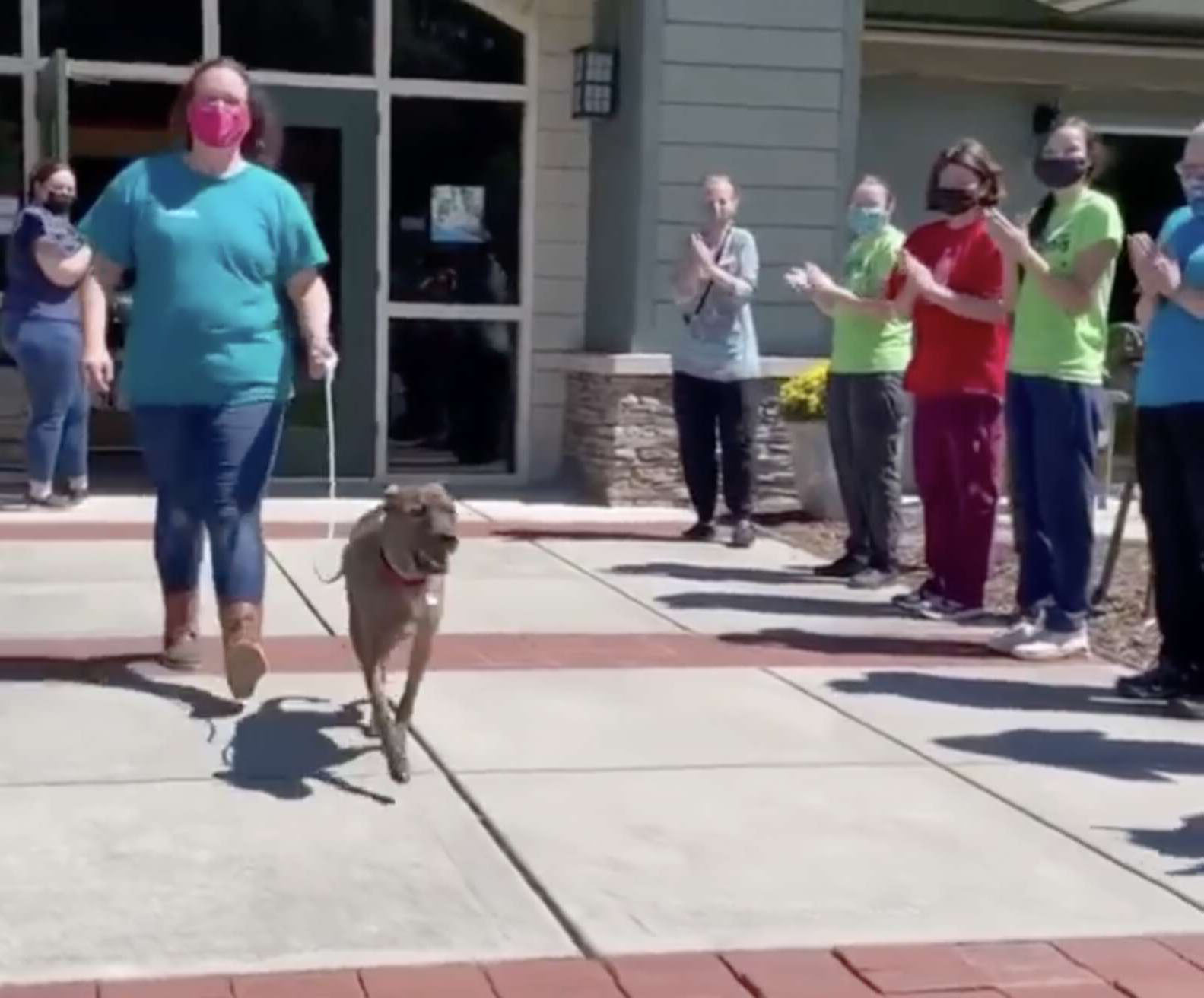 ▼不久前一名志工擔任Big Mac的寄養馬麻後,決定收編牠,給牠一個家。Big Mac離開收容所的那一天,所有的員工都聚集在門口,排隊拍手歡送牠,慶祝牠找到家的珍貴時刻。