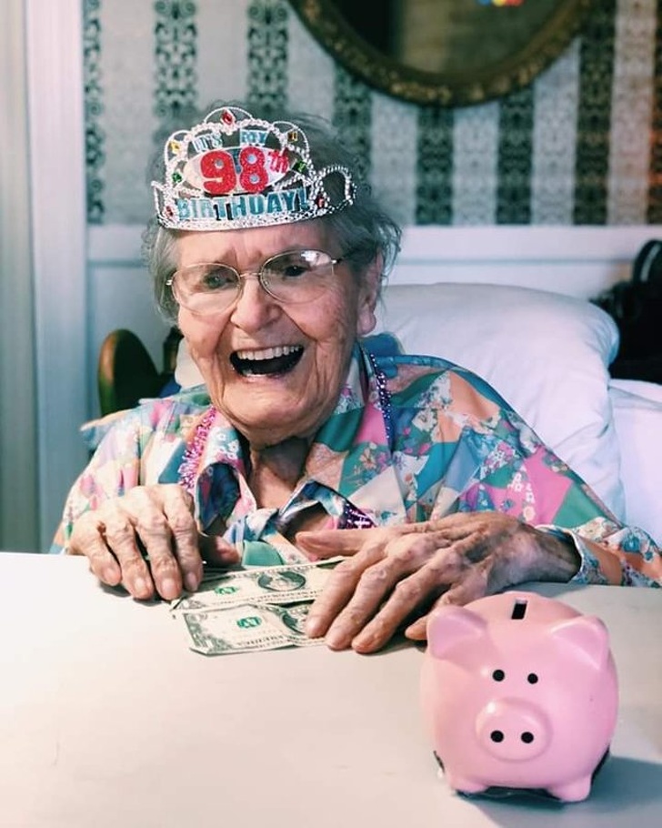 ▼3.「這是曾祖母的98歲生日!她習慣存錢,家人經常給她零錢。今年她的小豬存錢罐裡能多一些紙幣了。看看她的笑容,她真的很開心!」