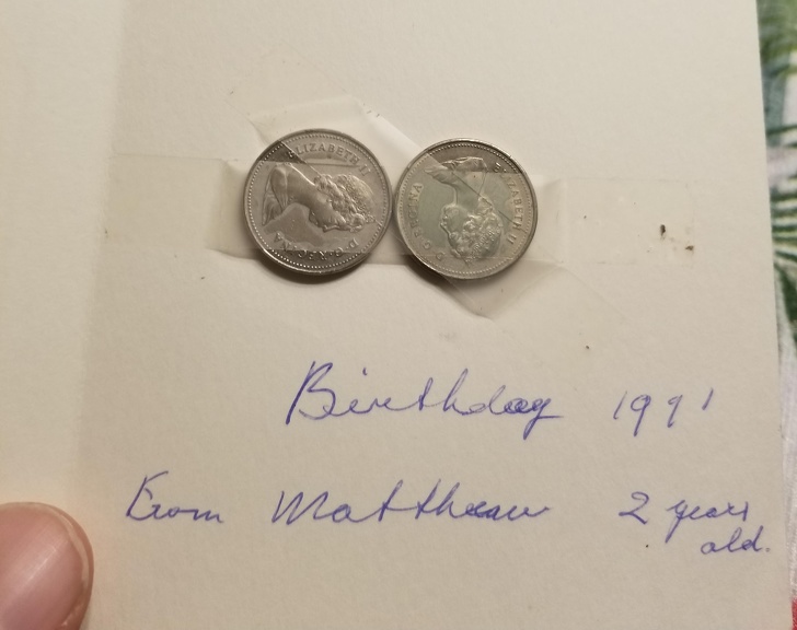 ▼13.「祖母最近離開了世界,媽媽整理她的遺物時發現了這個。這幾枚硬幣是我2歲時送給她的生日禮物,沒想到她一直保留著。」