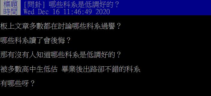 ▼原PO日前在PTT「八卦板」上發文「哪些科系是低調好的?」,他表示:「板上文章多數都在討論哪些科系過譽,哪些科系讀了會後悔?那有沒有人知道哪些科系是低調好的?被多數高中生低估,畢業後出路卻不錯的科系,有哪些呀?」