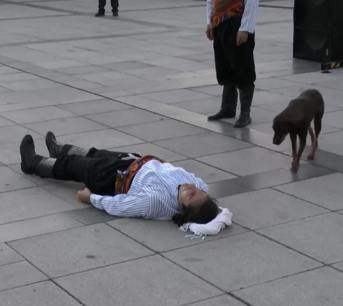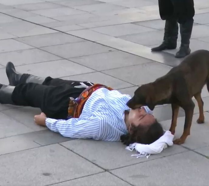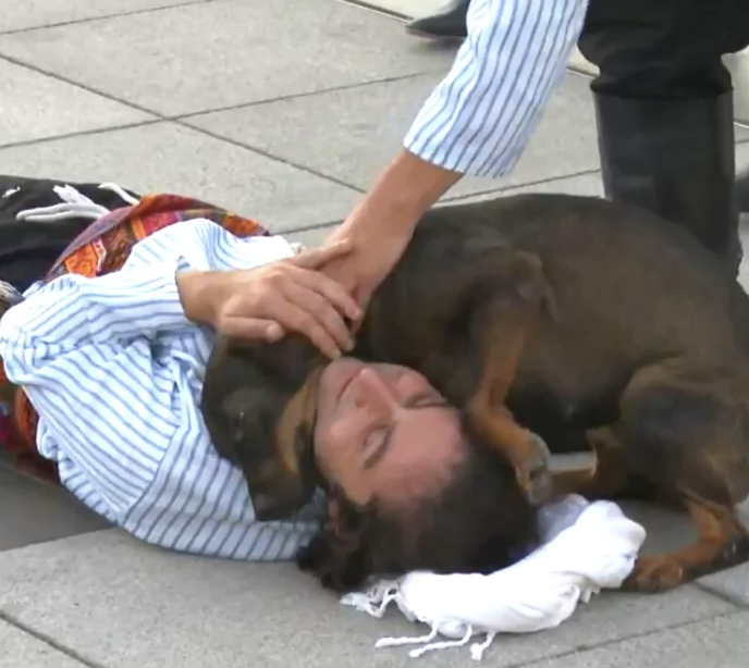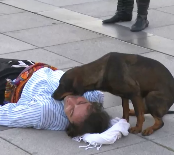 演技騙到浪浪!街頭表演「受傷倒地」 牠衝來關心:泥還好吧?