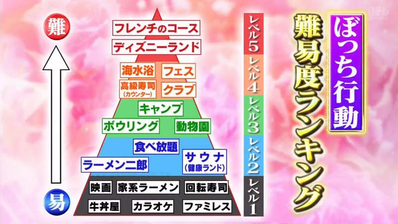 ▼用心的節目組還採訪了100位獨來獨往的女性,最終得出了下面這個「一個人做事情的難度排行榜」,原來在日本女生眼中一個人唱卡拉OK,一個人吃迴轉壽司都還比較容易做到,最高等級的原來是一個人去迪士尼樂園和一個人吃法式料理全餐。