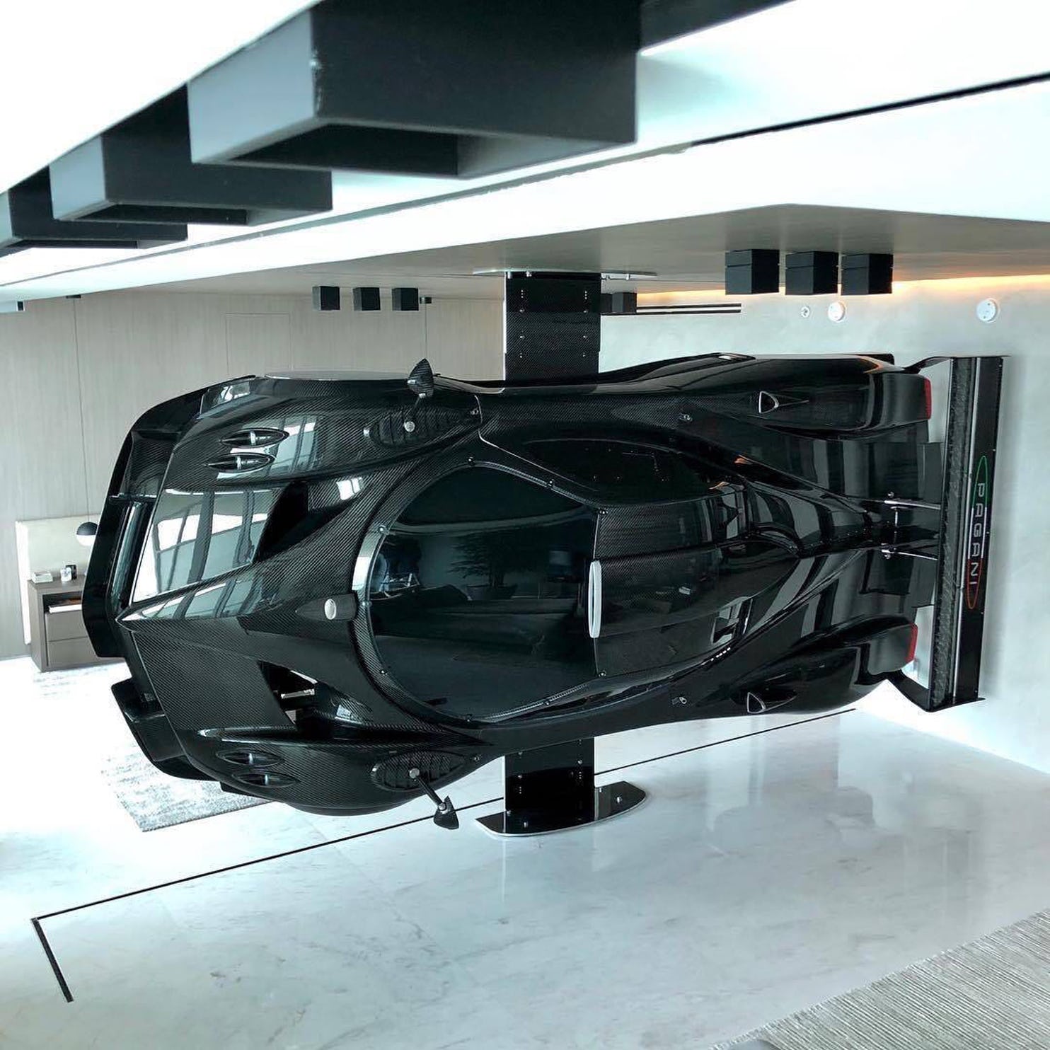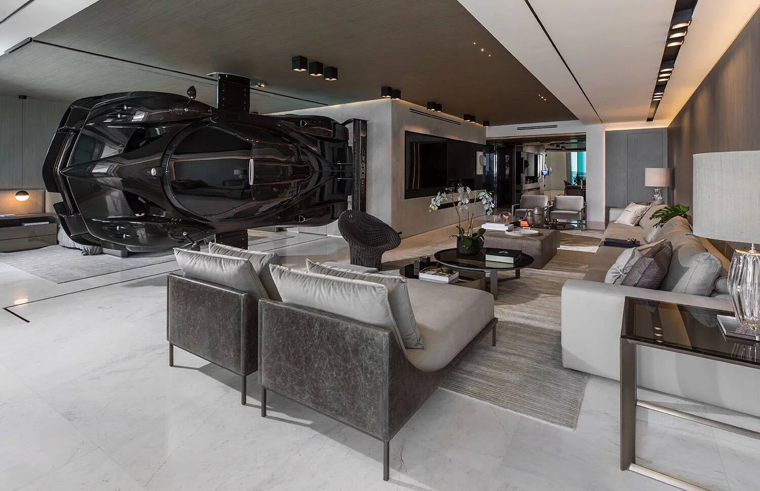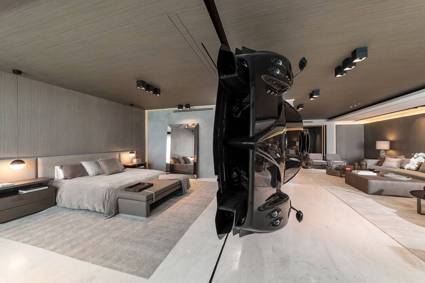 ▼這台Pagani Zonda R掛在客廳與主臥室間,相當於一個隔間牆。在客廳能夠看到車身,在臥室則能看到底盤。超跑僅由鋁及碳纖維製成的支架支撐,是公寓內一抹奢華的美景。除此之外,公寓內部整體空間大面積使用大理石和木紋質調鋪陳,整體顯得氣勢滂沱。