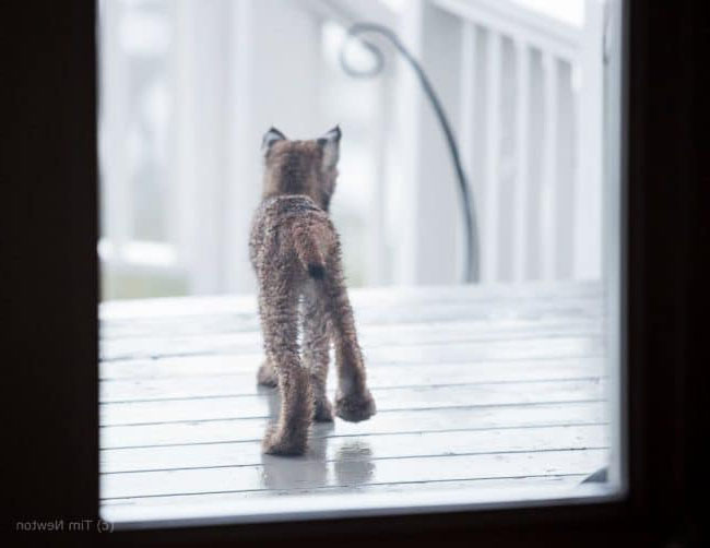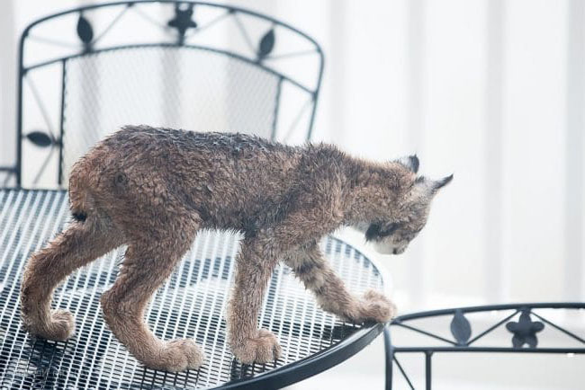 ▼猞猁寶寶們在陽台上玩了40分鐘,Tim全程躲在窗戶一邊拍攝。其中一隻小猞猁似乎注意到了他,好奇地來到他身邊。Tim說:「我不知道當時自己在想什麼,也許只是想跟牠打招呼吧-我把相機從我臉前往下移了一點點,把眼睛露出來,當時牠的表情真的是嚇傻了!牠的眼睛突然睜大,然後轉身逃跑!好險其他猞猁沒有發現狀況。」